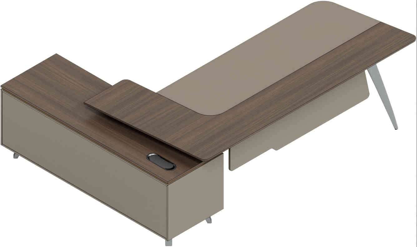 賓利系列產(chǎn)品外觀(guān)采用意式輕奢的設計風(fēng)格,主附臺面一體化,雙層面板,整體造型全方位的意式切割風(fēng)格,體現了產(chǎn)品造型的不對稱(chēng)美,主附配置大小八字鋼腳讓整個(gè)產(chǎn)品既有質(zhì)感又有美感,加上產(chǎn)品搭配爵士胡桃與條紋蘆灰的配色,充分體現產(chǎn)品高品位的氣質(zhì),是現代都市辦公空間最佳選擇之一。