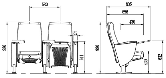 2.座椅基本中心距為580±10mm,座包打開(kāi)側深696±10mm,寫(xiě)字板打開(kāi)側深835±10mm,基本椅高為980±10mm,最小排距:900mm。